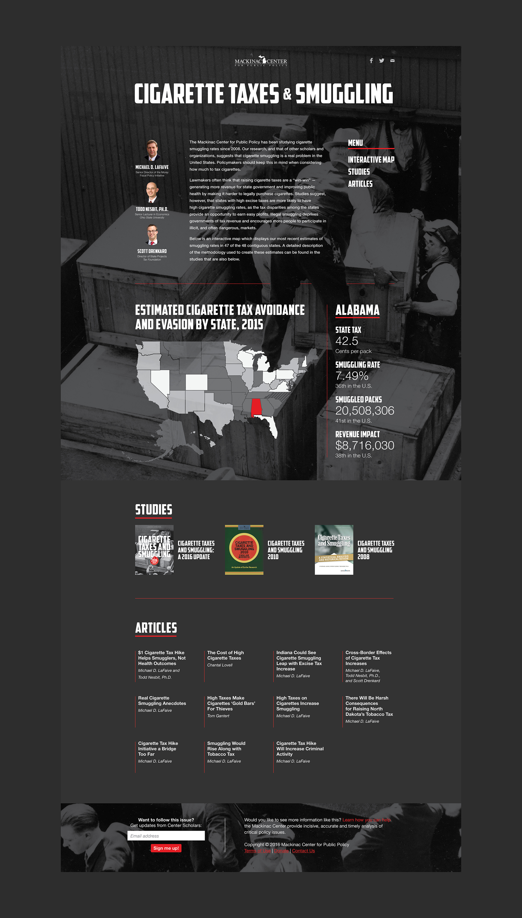 A website and accompanying study were needed to help highlight the correlation between high cigarette taxes and smuggling. I used a strong, retro font and imagery from the Prohibition era as a throwback to the days of gangsters and bootlegging.